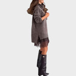 Aurora komplekt ühendab kaasaegse elegantsi hubase mugavusega, luues mitmekülgse ja naiseliku välimuse, mis on ideaalne jahedamateks päevadeks. See komplekt koosneb pehmest, soojast ja vaba lõikega oversized kõrge kaelusega kampsunist, mis on loodud igapäevaseks stiiliks. Riiet täiendab kerge ja delikaatne kleit, mille allääres on pitsist tüllikiht, lisades liikumist, võlu ja diskreetset sensuaalsust. Komplekt loob kauni kontrasti kampsuni mahukuse ja kleidi kerguse vahel.