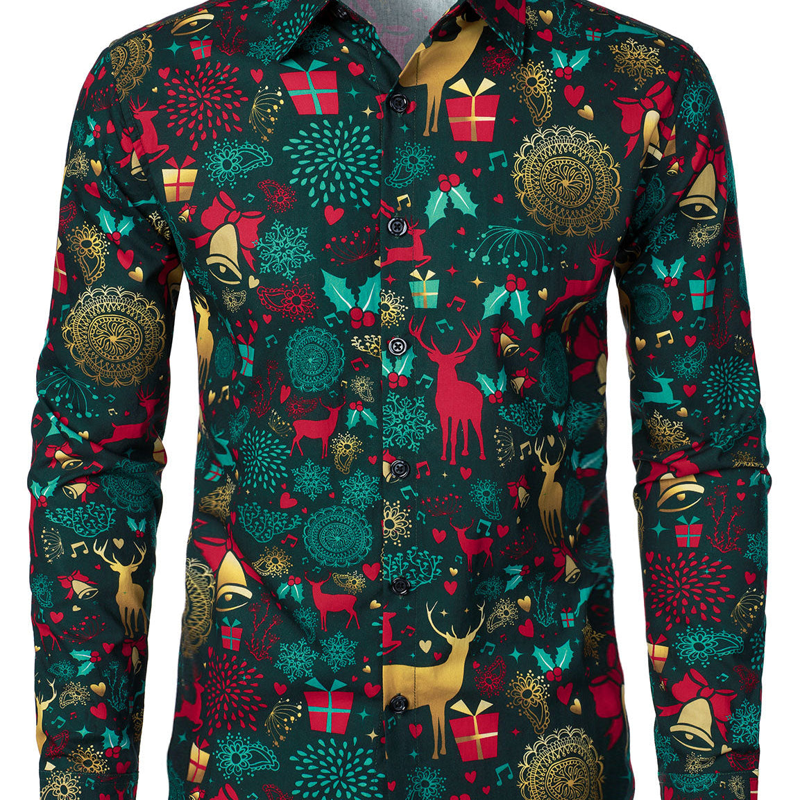 Meeste Jõulutrükk Regulaarne Sobivus Roheline Pikkade Varrukatega Särk