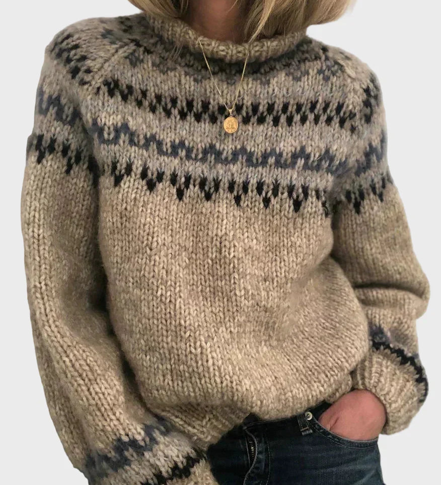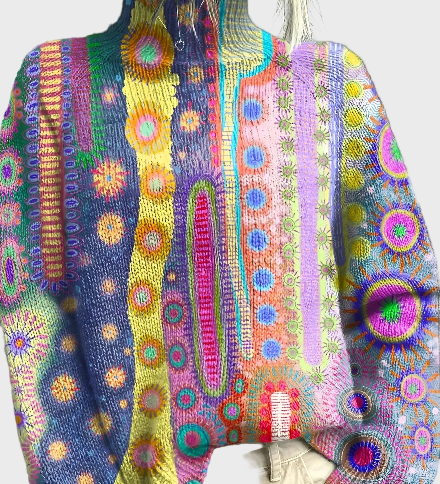 Kootud kõrge kaelusega kampsun päikesemustriga
