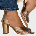 Need paksu kontsaga kuldsed sandaalid pakuvad elegantsi ja mugavust igale välimusele. Diagonaalsete triipudega disain ümbritseb jalga, andes ilmut ja stiili. Metallik viimistlus annab läikiva puudutuse, mis sobib ideaalselt nii õhtusteks väljasõitudeks kui ka pidulikumateks sündmusteks.
